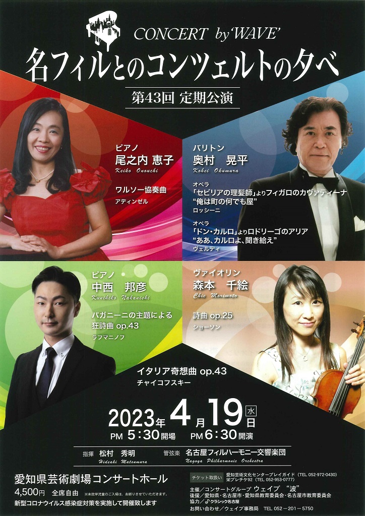 お問い合わせ先: ウェイブ事務局 Tel. 052-201-5750 主催: コンサートグループ ウェイブ“波” 【料金】【全席自由】 一般:¥4,500 |