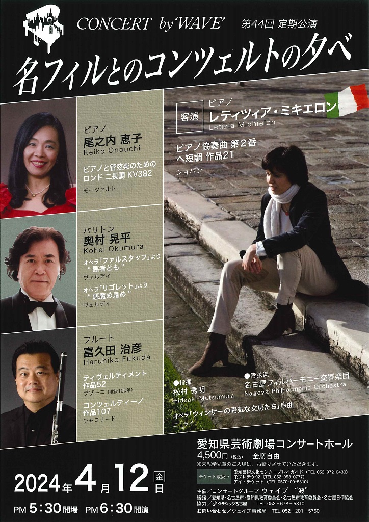 お問い合わせ先: ウェイブ事務局 Tel. 052-201-5750 主催: コンサートグループ ウェイブ“波” 【料金】【全席自由】 一般:¥4,500 |