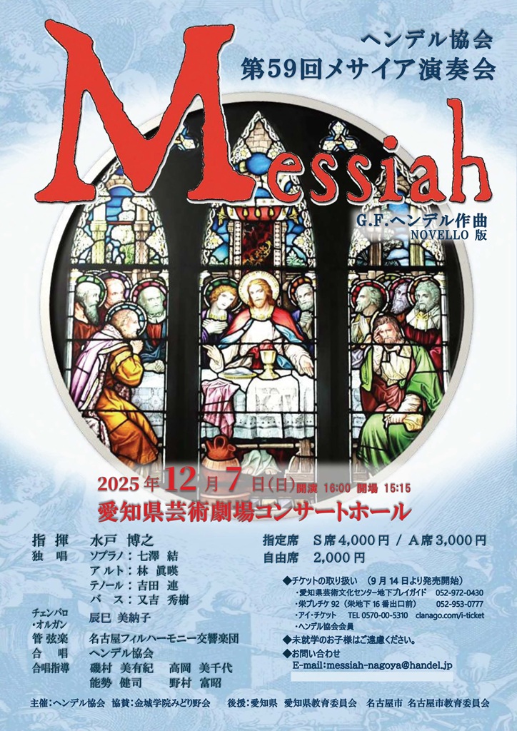 NANASAWA Yui, Soprano HAYASHI Mae, Mezzo Soprano YOSHIDA Ren, Tenor MATAYOSHI Hideki, Baritone TATSUMI Minako, Organ & Cembalo Nagoya Händel Society, Choir |