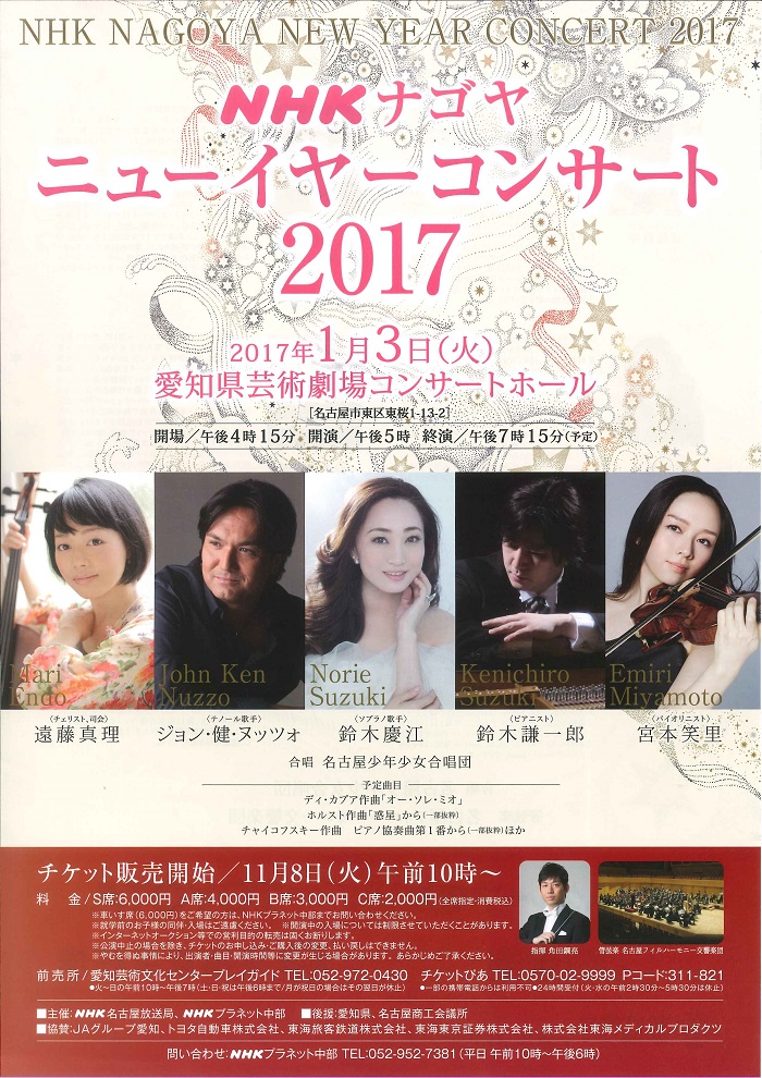 Emiri MIYAMOTO, Violin John Ken NUZZO, Tenor Norie SUZUKI, Soprano Kenichiro SUZUKI, Piano Mari ENDO, Cello, MC Nagoya Children's Choir, Boys' Choir Hiraku SHIBATA, MC |