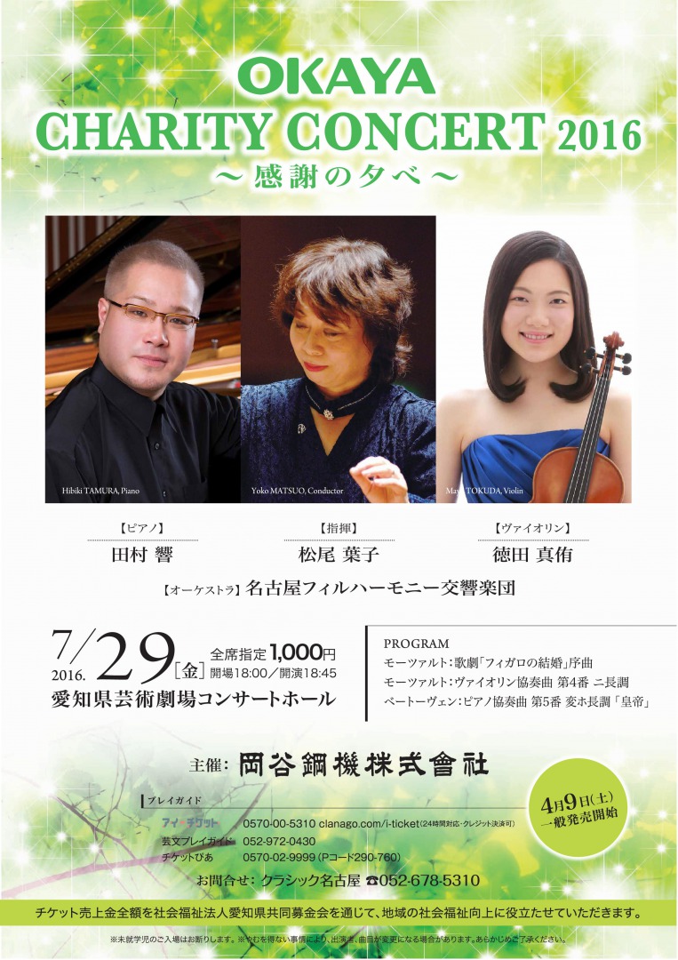 S: ¥7,200 A: ¥6,200 B: ¥5,100 C: ¥4,100 D: ¥3,100 Y: ¥1,000 (Only for 24 years old or less) <How to order tickets> Online: https://yyk1.ka-ruku.com/nagoya-phil-t/ (Japanese Only) E-mail: Please send e-mail (ticketguide@nagoya-phil.or.jp) with following details. – Concert Title, Ticket Section & Quantity – First & Last Name – Zip Code & Address – Phone Number Notice: Tickets for our concerts can be picked up at the venue on the day of the performance. |