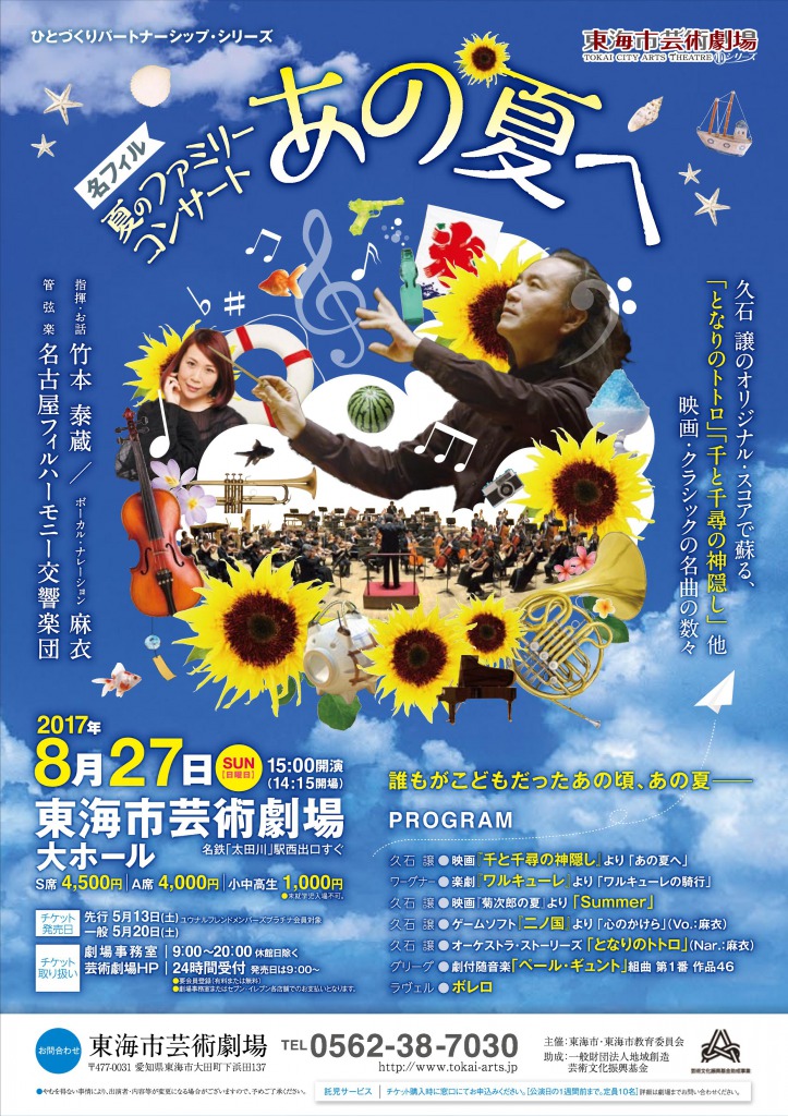 Adult & Child A (3 years old ~ Junior high school student): ¥700 <How to order tickets> Online: https://yyk1.ka-ruku.com/nagoya-phil-t/ (Japanese Only) E-mail: Please send e-mail (ticketguide@nagoya-phil.or.jp) with following details. – Concert Title, Ticket Section & Quantity – First & Last Name – Zip Code & Address – Phone Number Notice: Tickets for our concerts can be picked up at the venue on the day of the performance. |