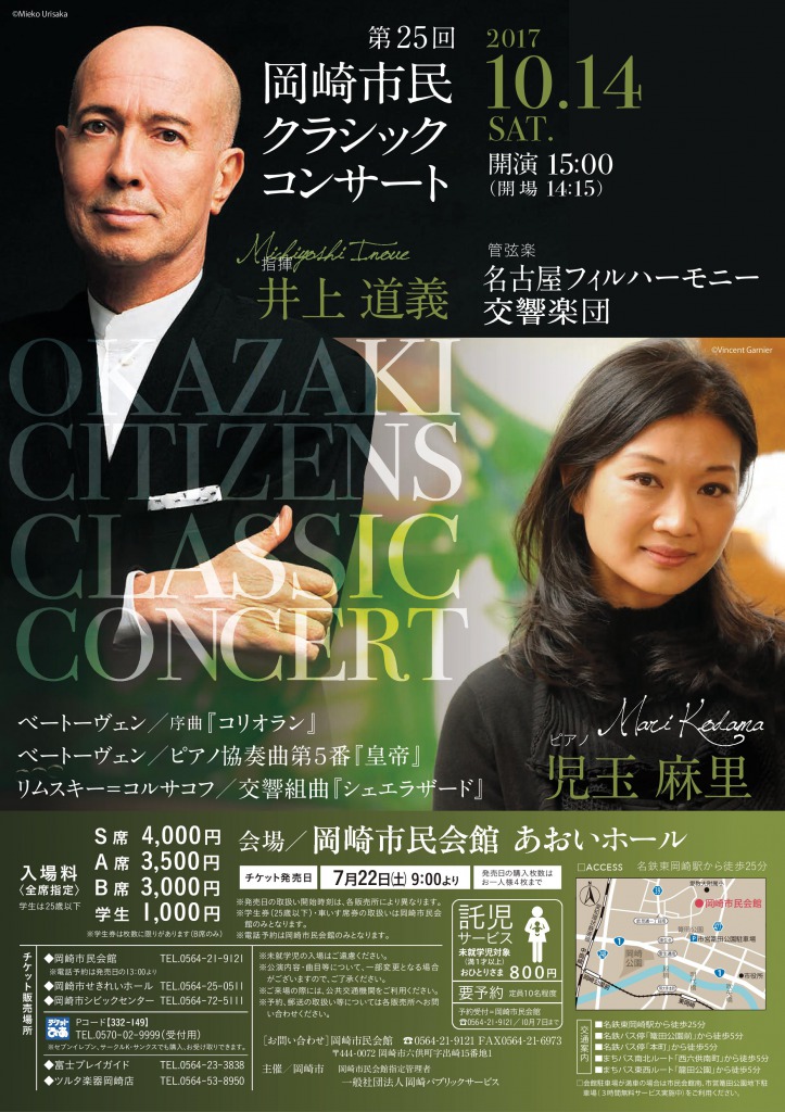 Platinum: ¥7,700 S: ¥5,100 A: ¥4,100 B: ¥3,100 C: ¥2,100 D: ¥1,500 Y: ¥1,000 (Only for 25 years old or less) <How to order tickets> Online: https://yyk1.ka-ruku.com/nagoya-phil-t/(Japanese Only) E-mail: Please send e-mail (ticketguide@nagoya-phil.or.jp) with following details. – Concert Title, Ticket Section & Quantity – First & Last Name – Zip Code & Address – Phone Number Notice: Tickets for our concerts can be picked up at the venue on the day of the performance. |