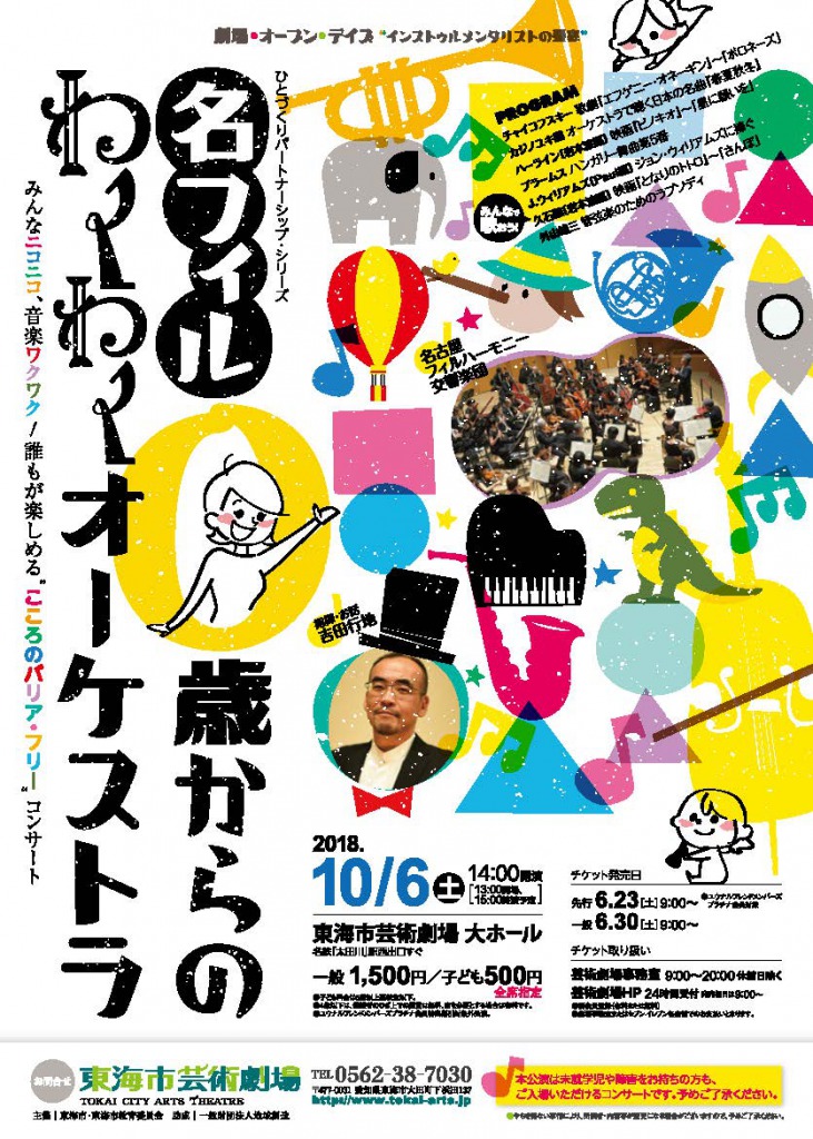 P. Tchaikovsky Polonaise from “Eugene Onegin”, Op. 24 arr. Y. Kajino Japanese Masterpieces for Orchestra L. Harline [arr. W. Iwamoto] When You Wish upon a Star J. Brahms Hungarian Dance No.5 arr. P. Lavender Tribute to John Williams [Let’s Sing Together!] J. Hisaishi [arr. W. Iwamoto] Stroll from the “My Neighbor Totoro” Y. Toyama Rhapsody for Orchestra [Concert starts 11:00am] Closed Concert [Concert starts 2:00pm] Adult: ¥500 Child(Less than 3 years old): Free of charge(Sit on parent’s lap) <How to order tickets> Online: https://yyk1.ka-ruku.com/nagoya-phil-t/ (Japanese Only) E-mail: Please send e-mail (ticketguide@nagoya-phil.or.jp) with following details. – Concert Title, Ticket Section & Quantity – First & Last Name – Zip Code & Address – Phone Number Notice: Tickets for our concerts can be picked up at the venue on the day of the performance. |