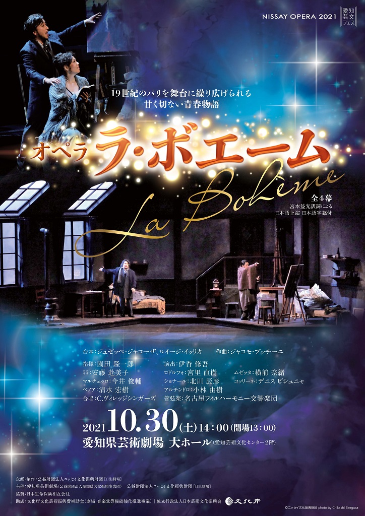 IKOH Shugo, Stage direction ANDO Fumiko, Soprano / Mimì MIYASATO Naoki, Tenor / Rodolfo YOKOMAE Nao, Mezzo-Soprano / Musetta IMAI Shunsuke, Baritone / Marcello KITAGAWA Tatsuhiko, Baritone / Schaunard Denys VYSHNIA, Bass / Colline SHIMIZU Hiroki, Bass-Baritone / Benoît KOBAYASHI Yoshiki, Baritone / Alcindoro C. Village Singers, Chorus |
