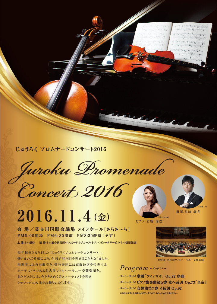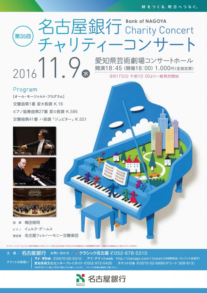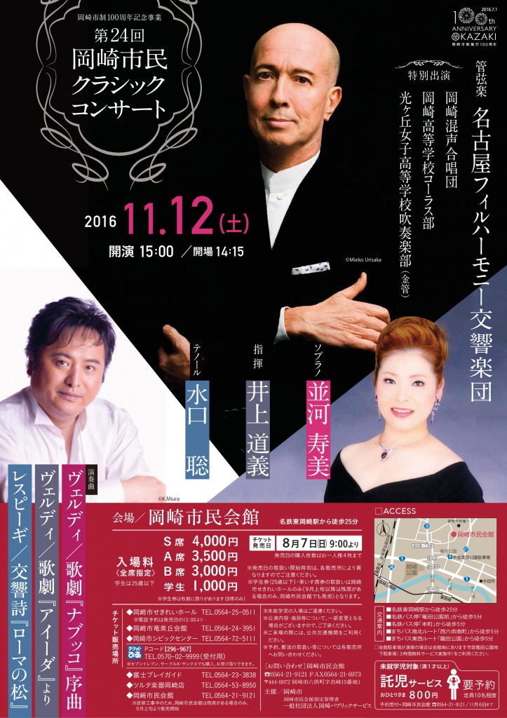 S: ¥6,000 A: ¥5,000 B: ¥4,000 C: ¥3,000 Y: ¥1,000 (Only for 24 years old or less) <How to order tickets> Online: https://yyk1.ka-ruku.com/nagoya-phil-t/ (Japanese Only) E-mail: Please send e-mail (ticketguide@nagoya-phil.or.jp) with following details. – Concert Title, Ticket Section & Quantity – First & Last Name – Zip Code & Address – Phone Number Notice: Tickets for our concerts can be picked up at the venue on the day of the performance. |