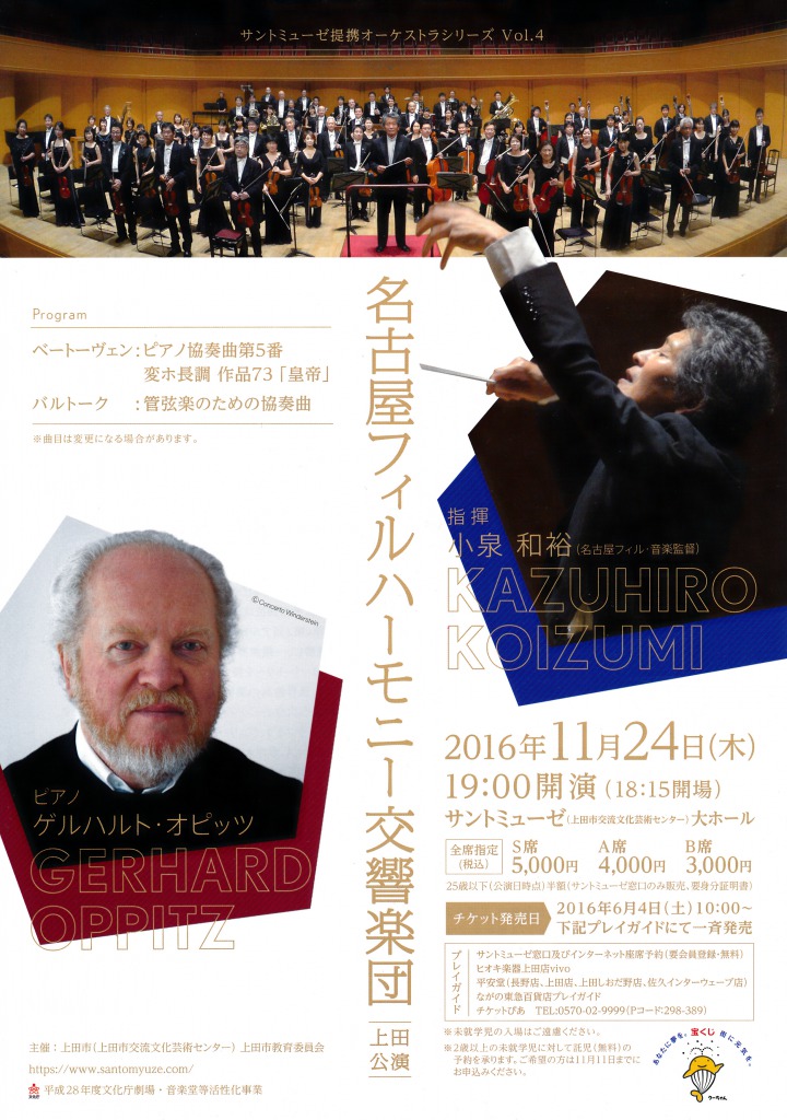 L. v. Beethoven Piano Concerto No.5 in E flat major, Op.73 “Emperor” B. Bartók Concerto for Orchestra etc. S: ¥5,000~D: ¥3,000 |