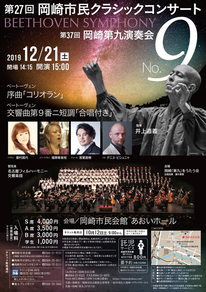 L. v. Beethoven Symphony No.9 in D minor, Op.125 “Choral” Select Platinum: ¥12,300 Platinum: ¥9,300 S: ¥6,200 A: ¥5,100 B: ¥4,100 C: ¥3,100 D: ¥2,100 Y: ¥1,000 (Only for 25 years old or less) <How to order tickets> Online: https://yyk1.ka-ruku.com/nagoya-phil-t/(Japanese Only) E-mail: Please send e-mail (ticketguide@nagoya-phil.or.jp) with following details. – Concert Title, Ticket Section & Quantity – First & Last Name – Zip Code & Address – Phone Number Notice: Tickets for our concerts can be picked up at the venue on the day of the performance. |