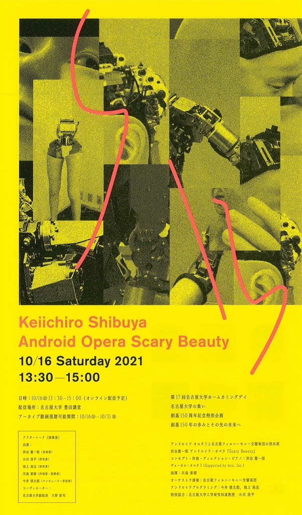 ペルト:フラトレス 渋谷慶一郎:アンドロイド・オペラ『Scary Beauty』 ※演奏後、渋谷慶一郎×小川浩平×川島素晴×今井慎太郎×池上高志によるアフタートークあり 無観客開催 【ライブ配信】 第17回名古屋大学ホームカミングデイの特設サイト内、各企画の企画詳細ページより視聴可能 【アーカイブ配信】 10/16(土)~10/31(日) ※ライブ配信後、期間中いつでも視聴可能