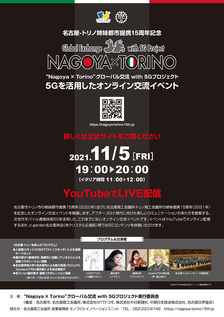 「“Nagoya×Torino” グローバル交流 with 5Gプロジェクト実行委員会」(構成:名古屋市、名古屋商工会議所、名古屋日伊協会、株式会社NTTドコモ、株式会社中日新聞社、中部日本放送株式会社)主催、名古屋市・トリノ市姉妹都市提携15周年並びに名古屋商工会議所・トリノ商工会議所姉妹提携15周年の記念事業の一環として、5Gをはじめとする最新のデジタル通信技術を活用して開催される、これまでにない海外交流イベントに名フィルが登場します。